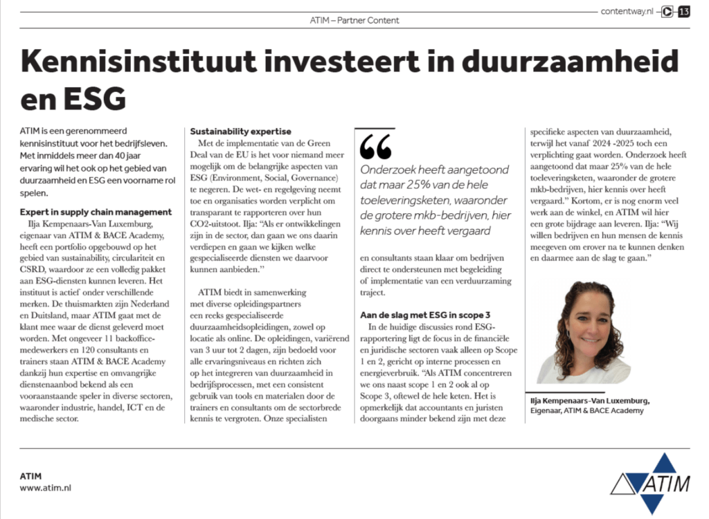 Onze eigen Ilja Kempenaars-Van Luxemburg, benadrukt het belang van onze opleidingen & diensten in ESG (Environment, Social, Governance), die cruciaal zijn voor bedrijven in deze veranderende wereld.